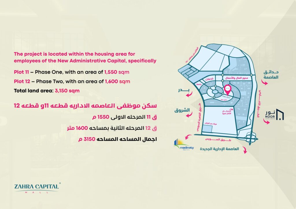 Zahraa Capital is a mixed-use service commercial project located in Badr Authority area (جهاز بدر), West of the New Administrative Capital, around 10 minutes from the capital. The project is designed to fill a major service gap in a fast-growing residential zone (Sakan Misr), where Phase 1 & 2 currently have limited/basic services. With expected high residential traffic driven by Sakan Misr (government-supported housing), Zahraa Capital is positioned as an early commercial destination serving residents’ daily needs.